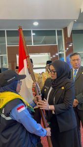 Dalam pelepasan tersebut, Bupati Barru didampingi Kepala Kemenag Barru secara simbolis menyerahkan bendera kepada Ketua Kloter, Minarni, S.Kom..